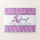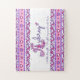 Personalised letter A monogram name and meaning jigsaw puzzle. Pretty hand drawn initial letter A monogram name and meaning girls jigsaw in purple, pink and white. Ideal for a personalised gift for a girl who has a name that starts with the letter A. This example reads Aubrey Noble strength. Bright, organised and clever or you can customise the text with your own name and message or words. Makes a unique girls birthday, or holidays gift. © Typographic letter A flowers and hearts hand drawing and pattern uniquely created by Sarah Trett. www.sarahtrett.com for www.mylittleeden.com