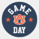 This spirited round sticker proudly showcases support for Auburn University on game day! It features the iconic Auburn "AU" logo prominently displayed at its centre, vibrant in its traditional orange and blue. Above and below the logo, the words "GAME" and "DAY" are boldly presented in white, arched lettering, perfectly capturing the excitement of game day. Two vibrant orange stars flank the 'AU' logo, adding to the energetic display. The sticker's bold navy blue background emphasizes the team colours, making it an ideal way to display allegiance to the Auburn Tigers on any surface.
