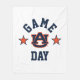 This cosy fleece blanket proudly showcases support for Auburn University on game day! It features the iconic Auburn "AU" logo prominently displayed at its centre, vibrant in its traditional orange and blue. Above and below the logo, the words "GAME" and "DAY" are boldly presented in blue, arched lettering, perfectly capturing the excitement of game day. Two orange stars with blue outlines flank the 'AU' logo, adding to the energetic display. This impactful and recognisable design is ideal for staying warm while cheering on the Auburn Tigers, whether at home or at the stadium.