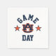 This spirited square paper napkin design proudly showcases support for Auburn University! It features the iconic Auburn "AU" logo prominently displayed at its centre, vibrant in its traditional orange and blue. Above and below the logo, the words "GAME" and "DAY" are boldly presented in blue, arched lettering, perfectly capturing the excitement of game day. Two vibrant orange stars flank the 'AU' logo, adding to the energetic display. The napkin's clean white background and subtle orange border make it an ideal choice for any game day celebration or gathering.