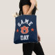 This spirited tote bag proudly showcases support for Auburn University on game day! Its bold navy blue background sets the stage for the iconic Auburn "AU" logo, prominently displayed at its centre, vibrant in its traditional orange and blue. Above and below the logo, the words "GAME" and "DAY" are boldly presented in white, arched lettering, perfectly capturing the excitement of game day. Two vibrant orange stars with white outlines flank the 'AU' logo, adding to the energetic display. This impactful and recognisable design is ideal for carrying essentials to games, classes, or everyday errands, embodying the competitive spirit and strength of the Auburn Tigers.