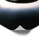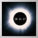 Artistic Image of a total solar eclipse in black and white dated August 21, 2017, showing the bright glow of the sun’s corona radiating from behind the blocking image of the full moon.