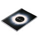 Artistic Image of a total solar eclipse in black and white dated August 21, 2017, showing the bright glow of the sun’s corona radiating from behind the blocking image of the full moon.