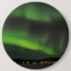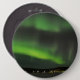 Button with green rays of aurora borealis (northern lights) in the night sky over a frozen lake in Lapland.