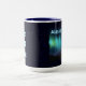 A multi-coloured, fractal rendering of the aurora borealis, or Northern Lights, superimposed on a digital painting of snow-covered mountains. Text reading "Alaska" appears in glowing blue and white. Add your own additional text on the reverse side. The aurora borealis (or Northern Lights), named after the Roman goddess of dawn, Aurora, and the Greek name for the north wind, Boreas. Many cultural groups have legends about the lights. In mediaeval times, the occurrences of auroral displays were seen as harbingers of war or famine. The Maori of New Zealand shared a belief with many northern people of Europe and North America that the lights were reflections from torches or campfires. The Menominee Indians of Wisconsin believed that the lights indicated the location of manabai'wok (giants) who were the spirits of great hunters and fishermen. The Inuit of Alaska believed that the lights were the spirits of the animals they hunted: the seals, salmon, deer and beluga whales. Other aboriginal peoples believed that the lights were the spirits of their people. The connection between the Northern Lights and sunspot activity was suspected as far back as 1880. Thanks to research conducted since the 1950's, we now know that electrons and protons from the sun are blown towards the earth on the 'solar wind'. (Note: 1957-58 was International Geophysical Year and the atmosphere was studied extensively with balloons, radar, rockets and satellites. Rocket research is still conducted by scientists at Poker Flats, a facility under the direction of the University of Alaska at Fairbanks. The temperature of the sun's atmosphere is millions of degrees. At this temperature, collisions between gas molecules are frequent and explosive. Free electrons and protons are thrown from the sun's atmosphere by the rotation of the sun and escape through holes in the magnetic field. carried eartward in the solar wind, the charged particles are largely deflected by the earth's magnetic field. However, the earth's magnetic field is weaker at either pole and therefore some particles enter the earth's atmosphere and collide with gas particles in the higher layers (thermosphere). These collisions emit light that we perceive as the dancing lights of the north (and the south). Most aurorae occur in a band known as the auroral zone,which is typically 3° to 6° in latitudinal extent and at all local times or longitudes. The auroral zone is typically 10° to 20° from the magnetic pole defined by the axis of the Earth's magnetic dipole. During a geomagnetic storm, the auroral zone will expand to lower latitudes. The diffuse aurora is a featureless glow in the sky which may not be visible to the unaided eye even on a dark night and defines the extent of the auroral zone. The discrete aurora are sharply defined features within the diffuse aurora which vary in brightness from just barely visible to the unaided eye to bright enough to read a newspaper at night. Discrete aurorae are usually observed only in the night sky because they are as bright as the sunlit sky. Aurorae occasionally occur poleward of the auroral zone as diffuse patches or arcs (polar cap arcs, which are generally invisible to the unaided eye. Because the phenomena occurs near the magnetic poles, northern lights have been seen as far south as New Orleans in the western hemisphere, while similar locations in the east never experience the mysterious lights. However the best places to watch the lights (in North America) are in the northwestern parts of Canada, particularly the Yukon, Nunavut, Northwest Territories and Alaska. Auroral displays can also be seen over the southern tip of Greenland and Iceland, the northern coast of Norway and over the coastal waters north of Siberia. Southern auroras are not often seen as they are concentrated in a ring around Antarctica and the southern Indian Ocean. Auroral displays appear in many colours. Variations in colour are due to the type of gas particles that are colliding. The most common auroral colour, a pale yellowish-green, is produced by oxygen molecules located about 60 miles above the earth. Rare, all-red auroras are produced by high-altitude oxygen, at heights of up to 200 miles. Nitrogen produces blue or purplish-red aurora. The lights appear in many forms from patches or scattered clouds of light to streamers, arcs, rippling curtains or shooting rays that light up the sky with an eerie glow. Curtain-like structures show field lines in the Earth's magnetic field . The auroras that resulted from the "great geomagnetic storm" on both 28 August and 2 September 1859 are thought the most spectacular in recent recorded history. It was reported by the New York Times that in Boston on Friday 2 September 1859 the aurora was "so brilliant that at about one o'clock ordinary print could be read by the light". The aurora is thought to have been produced by one of the most intense coronal mass ejections in history, very near the maximum intensity that the Sun is thought to be capable of producing. It is also noteable for the fact that it is the first time where the phenomena of auroral activity and electricity were unambiguously linked. This insight was made possible not only due to scientific magnetometer measurements of the era, but also as a result of a significant portion of the 125,000 miles (201,000 km) of telegraph lines then in service being significantly disrupted for many hours throughout the storm. Some telegraph lines, however, seem to have been of the appropriate length and orientation to produce a sufficient geomagnetically induced current from the electromagnetic field to allow for continued communication with the telegraph operator power supplies switched off. Both Jupiter and Saturn have magnetic fields much stronger than Earth's (Jupiter's equatorial field strength is 4.3 gauss, compared to 0.3 gauss for Earth), and both have large radiation belts. Auroras have been observed on both, most clearly with the Hubble Space T