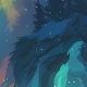 A seamless pattern featuring the blue-green and yellow hues of the aurora borealis, with silhouettes of pine trees scattered throughout. The design captures the ethereal beauty of the northern lights against a serene forest backdrop.