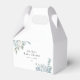 This baby shower favour box features elegant dusty blue and white florals and an elegant minimalist font. This style is perfect for any simple and classic event.