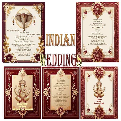 A luxurious wedding card for grand Indian marriages. Lord Ganesha is considered auspicious and associated with Indian ceremonies and pooja. The design features gold ornate leafy swirls border, floral motifs of gold and maroon palette. Reverse side has Lord Ganesha. The text can be easily modified with your words. Perfect for modern and traditional Indian weddings.