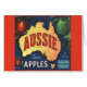 Aussie Apples from Tasmania is a vintage fruit crate label from 1933 . A map of Australia in the centre with red and green apples around it.