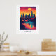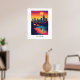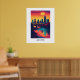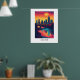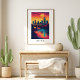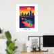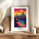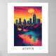 Bold and colorful poster of Austin’s skyline with a glowing sunset, downtown buildings, a river reflection, and lush trees in vivid hues.