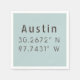 Austin Texas longitude and latitude coordinates in distressed fonts give this a modern urban look
