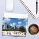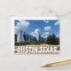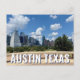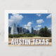 This modern Austin Texas postcard features beautiful blue sky and clouds above the city skyline. All of the new buildings against the pretty green trees that epitomises the beauty of the urban downtown and nature of the place. Great travel postcards for a keepsake or for a local Austinite that likes to explore Butler Park, Liz Carpenter splash pad, and Auditorium Shores.
