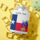 Can cooler designed with the Texas state flag and bluebonnets on one side and downtown Austin at dusk on the other. Red, white and blue colours throughout, for the patriotic look.