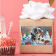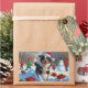 A heartwarming holiday illustration featuring a cheerful dog playing in the snow, wearing a Santa hat and surrounded by colourful gift boxes. In the background, children build a snowman beside a snow-covered Christmas tree, creating a joyful winter wonderland. Perfect for spreading holiday cheer and capturing the magic of Christmas.