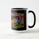 This mug was designed by North Carolina artists Ann LePere and Susan Phillips, based on early 20th century iconic produce packing crates. It shows red and blue cattle dogs - or heelers - against Australia's Ayers Rock with a herd of cattle. Australia Cattle Dog is set against a field of boomerangs. The text above: Accept no substitutes when intelligence, loyalty and drive are crucial. The text below: Choose the ACD brand when you need a dog you can count on.