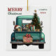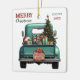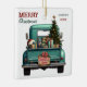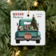 A teal blue retro pickup truck carries a decorated Holiday tree and gift packages on this cute ceramic Christmas ornament. Looking out from the tailgate is a beautiful black and tan Australian Kelpie dog. A rustic wooden sign on the back bumper says "Christmas Cheer". The red and green stylised text at the top left says "MERRY CHRISTMAS", with your name (or your dog's) and the year at the right. Both sides have the same image.