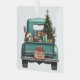 A teal blue retro pickup truck carries a decorated Holiday tree and gift packages on this cute glass Christmas ornament. Looking out from the tailgate is a beautiful black and tan Kelpie Dog. A Santa Claus hat sits on one of the gift packages, and a rustic wooden sign on the back bumper says "Christmas Cheer".