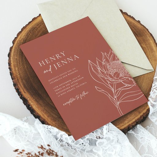 Introducing our Boho Australian Native Waratah Protea Wedding Invitation Suite, a breathtaking blend of rustic charm and natural elegance that sets the perfect tone for your special day. The warm, earthy color palette with hues of terracotta, burnt orange, and deep greens sets the stage for your boho-inspired celebration. Inspired by the wild and untamed beauty of Australian native flora, this suite exudes warmth and a bohemian spirit that will make your wedding truly unforgettable.