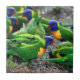 These bright coloured rainbow lorikeet birds are bright green, blue, red, and yellow. I took this photo of a large group of them feeding on the ground in Victoria Australia near Cape Otway.