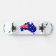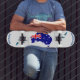 The flag design displayed on the skateboard prominently features a vector image set against a crisp white background, enhanced by turquoise-coloured feathers placed at both ends. This artistic composition is complemented by the inclusion of typography that boldly proclaims "Australia," effectively conveying national pride and identity through a modern design lens. The harmonious interplay of colours and elements contributes to an eye-catching and meaningful representation suitable for the sport.