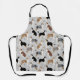 Cute Australian Shepherds / Aussie dogs in black, brown and merle coats sit and stand scattered dog bones and paw prints on a light grey background.