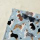 Cute Australian Shepherds / Aussie dogs in black, brown and merle coats sit and stand scattered dog bones and paw prints on a light blue background.
