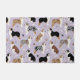 Cute Australian Shepherds / Aussie dogs in black, brown and merle coats sit and stand scattered dog bones and paw prints on a light purple background.