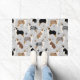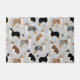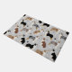 Cute Australian Shepherds / Aussie dogs in black, brown and merle coats sit and stand scattered dog bones and paw prints on a light grey background.