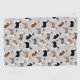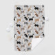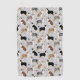 Cute Australian Shepherds / Aussie dogs in black, brown and merle coats sit and stand scattered dog bones and paw prints on a light grey background.