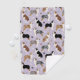 Cute Australian Shepherds / Aussie dogs in black, brown and merle coats sit and stand scattered dog bones and paw prints on a light blue background.