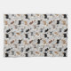 Cute Australian Shepherds / Aussie dogs in black, brown and merle coats sit and stand scattered dog bones and paw prints on a light grey background.