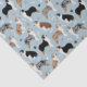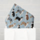 Cute Australian Shepherds / Aussie dogs in black, brown and merle coats sit and stand scattered dog bones and paw prints on a light blue background.