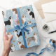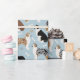 Cute Australian Shepherds / Aussie dogs in black, brown and merle coats sit and stand scattered dog bones and paw prints on a light blue background.