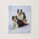 Australian shepherd male and female dogs sitting on the snow tongue out of the mouth after having played