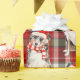 An adorable watercolor illustration of an Australian Shepherd sits with a fun red and green plaid patterned background in a soft, pale grey. The dog is a tricolor and wears a red Santa hat with a matching red and white striped winter scarf.