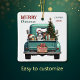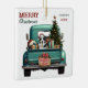 A teal blue retro pickup truck carries a decorated Holiday tree and gift packages on this cute ceramic Christmas ornament. Looking out from the tailgate is a beautiful Australian Shepherd dog. A rustic wooden sign on the back bumper says "Christmas Cheer". The red and green stylised text at the top left says "MERRY CHRISTMAS", with your name (or your dog's) and the year at the right. Both sides have the same image.