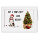 A beautiful multi-coloured Australian Shepherd has its head cocked as it waits for the holidays. A decorated Christmas tree is nearby. Paw prints surround the dog making for a humourous play on words.