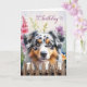 A lovely garden in the background with blooming Gladiolus flowers add colour to this sweet birthday card with an adorable Australian Shepherd dog peeking over a wooden fence.