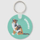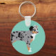 This keychain is ready to be personalised with a name and has realistic style illustrations of Australian Shepherd Dogs or Aussies set against a mint green background.