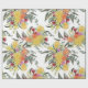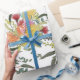 Aussie summer blooms wildflower wrapping paper showcasing wattle, grevillea, summer eucalyptus flowers, and gum nuts in a chic bold summer colour palette. Designed by Aussie artist Jo Story of Sketchbook Designs.