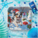 A heartwarming holiday illustration featuring a cheerful dog playing in the snow, wearing a Santa hat and surrounded by colourful gift boxes. In the background, children build a snowman beside a snow-covered Christmas tree, creating a joyful winter wonderland. Perfect for spreading holiday cheer and capturing the magic of Christmas.
