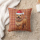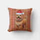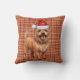 An Australian Terrier dog makes a cute Christmas pillow in his red Santa hat, then paired with a red and gold holiday plaid to brighten the pet lover's holiday home decor.