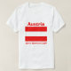 An editable title and slogan accompanies the red and white horizontal bands of the Austrian flag on the front of this t-shirt. The back displays a detailed map of Austria.