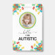 The Autism ID Badge features a front side adorned with a personalised photo of the individual, providing a visual representation of their unique identity. Bold text boldly declares "Hello, I am autistic", affirming the individual's identity with clarity and confidence. Adjacent to the text is an illustration of the autism ribbon, symbolising support and awareness for autism spectrum disorder. The background of the badge is adorned with a puzzle pattern, representing the complexity and diversity within the autism community.