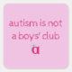 Image is the text in a magenta coloured sketch font: autism is not a boys' club. Below the text is the AWN logo of a magenta lower case a with a blue and grey spoon-shaped dragonfly perched on top.