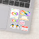 A set of autism acceptance stickers for autistic people and their families. The designs are: "Autism acceptance" with a rainbow infinity, "neurodiversity" written over a rainbow ribbon, "Autism isn't a tragedy. Ignorance is", a single rainbow infinity symbol to represent autism pride and neurodiversity, "Autism Awareness" with awareness crossed out and replaced by "Acceptance", "Flappy hands are happy hands", and "Hello, I am AUTISTIC" in a nametag style.