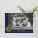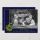 Your colour photo will be automatically converted to a stylish black and white image when uploaded to this modern clean photo Christmas card design. Your family photo filling the card face behind a blue and gold frame highlighted with a pine and holly bough. Bottom band holds your names and Christmas greeting in a soft green font. Sparkling gold Merry Christmas pattern on back against a dark Christmas blue.