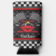 Auto Racing Race Car Design Seltzer Can Cooler with customisable text on two sides.