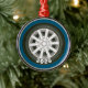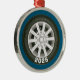 Photograph of automobile wheel on green background. with date printed on the bottom of the tire.