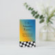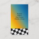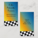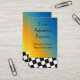 A cool design in shades of yellow, orange and blue accented by a black and white checkered border. Customize with all of your business information as desired.